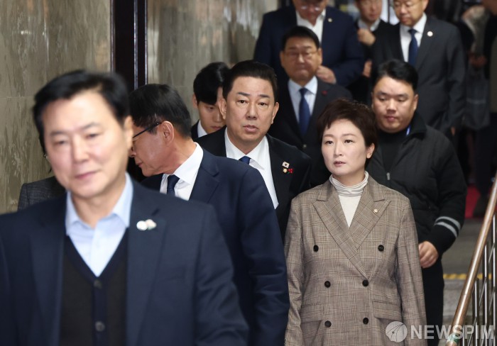 [서울=뉴스핌] 최지환 기자 = 김병기 더불어민주당 원내대표를 비롯한 더불어민주당 의원들이 8일 오전 서울 여의도 국회에서 열린 비공개 의원총회에 입장하고 있다. 2025.12.08 choipix16@newspim.com