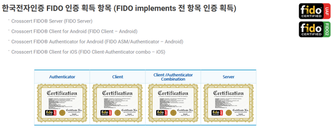 | 한국전자인증의 FIDO, FIDO2 인증 획득 항목 [사진=한국전자인증] |