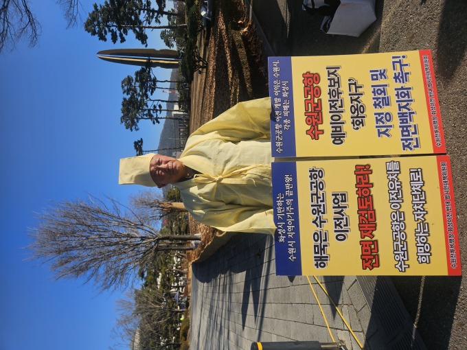[화성=뉴스핌] 박노훈 기자 = 화성시민단체 '수원전투비행장 화성이전 반대 범시민대책위원회'(범대위)는 8일부터 국방부 앞에서 1인 릴레이시위를 진행한다고 밝혔다.