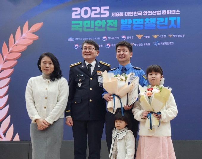 동해해양경찰서 삼척파출소 김정봉 경사가 개발한 '팽창형 드로우백'이 2025 국민안전 발명챌린지에서 우수 아이디어로 선정돼 동상을 수상했다. 김정봉 경사 가족들이 동상 수상을 축하하며 기념사진을 찍고 있다.[사진=동해해양경찰서] 2025.12.08 onemoregive@newspim.com