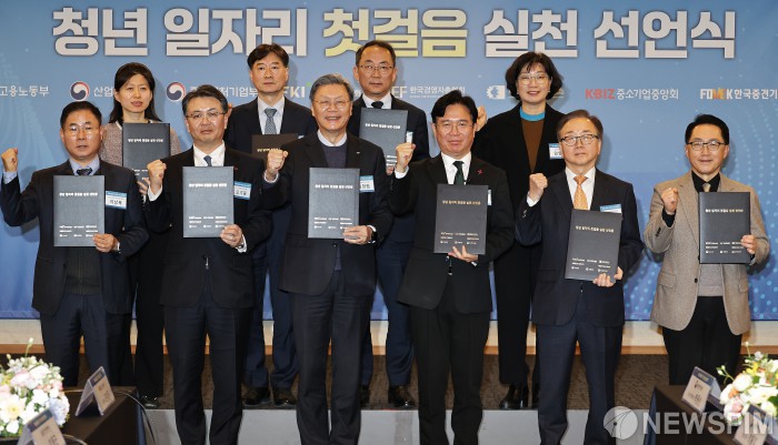 [서울=뉴스핌] 양윤모 기자 = 김영훈 고용노동부 장관이 8일 오후 서울 중구 한국프레스센터에서 개최된 '청년 일자리 첫걸음 실천 선언식'에서 참석자들과 파이팅을 외치며 기념촬영을 하고 있다. 행사에는 김영훈 고용노동부 장관, 김창범 한국경제인협회 상근부회장, 이동근 한국경영자총협회 상근부회장, 이상복 대한상공회의소 인력개발사업단장, 오기웅 중소기업중앙회 상근부회장, 이호준 한국중견기업연합회 상근부회장이 참석했다. 2025.12.08 yym58@newspim.com