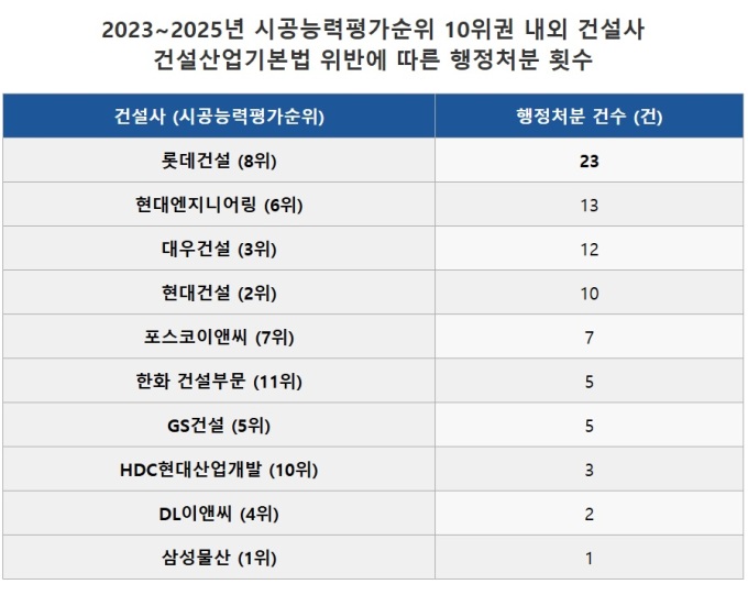 이외에도 포스코이앤씨(7번), GS건설(5번), 한화 건설부문(5번), HDC현대산업개발(3번), DL이앤씨(2번), 삼성물산(1번) 등이 건산법 위반에 따라 행정처분을 받았다. GS건설은 2023년 인천 검단 아파트 지하 주차장 붕괴로 인한 영업정지 건이 포함됐다. HDC현대산업개발도 2022년 광주 화정 아이파크 붕과 사고로 부과받은 영업정지 건이 함께 집계됐다.