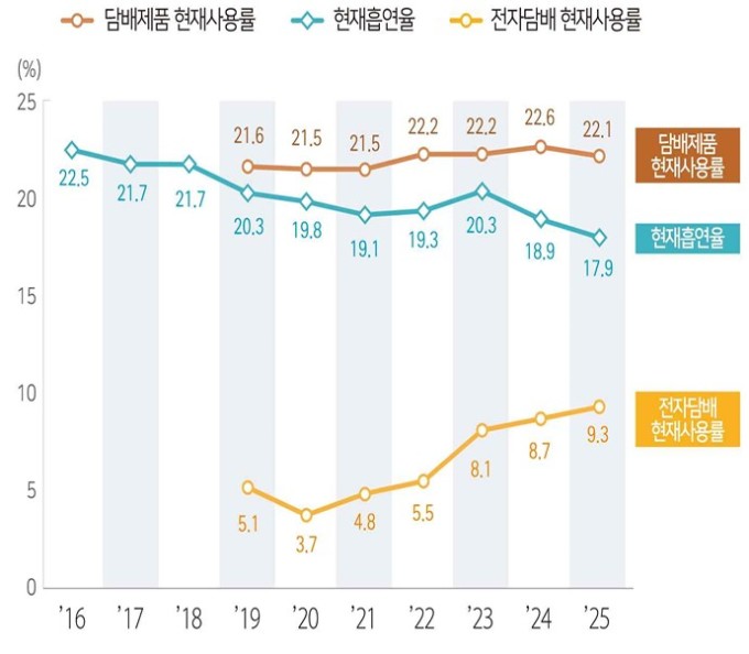 현재흡연율은 17.9%로 전년 대비 0.1%포인트(p) 감소했다. 그러나 전자담배 사용률은 전년 대비 0.6%p 늘어 9.3%로 집계됐다. 일반담배와 전자담배를 모두 포함한 전체 담배제품 사용률은 22.1%로 전년 대비 0.5%p 감소했다. 그러나 2019년 대비 전자담배 사용률은 82% 늘었다. 일반 담배의 현재 흡연율은 12% 감소했다.