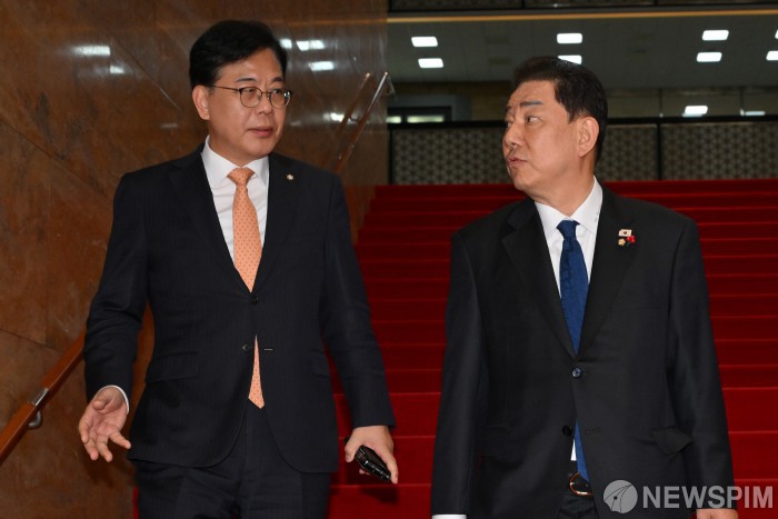 [서울=뉴스핌] 정일구 기자 = 김병기 더불어민주당 원내대표와 송언석 국민의힘 원내대표가 9일 서울 여의도 국회에서 우원식 국회의장 주재 회동을 마치고 이동하고 있다. 2025.12.09 mironj19@newspim.com