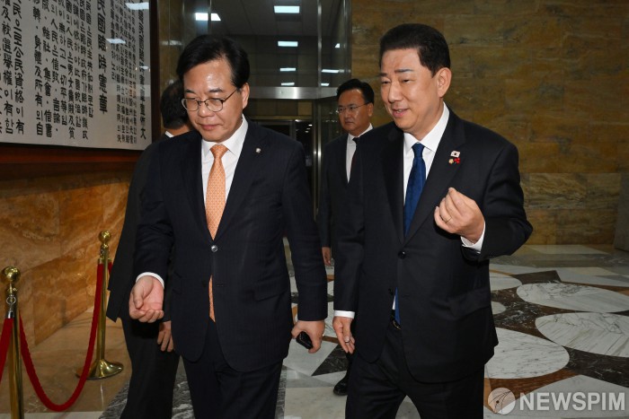 [서울=뉴스핌] 정일구 기자 = 김병기 더불어민주당 원내대표와 송언석 국민의힘 원내대표가 9일 서울 여의도 국회에서 우원식 국회의장 주재 회동을 마치고 이동하고 있다. 2025.12.09 mironj19@newspim.com