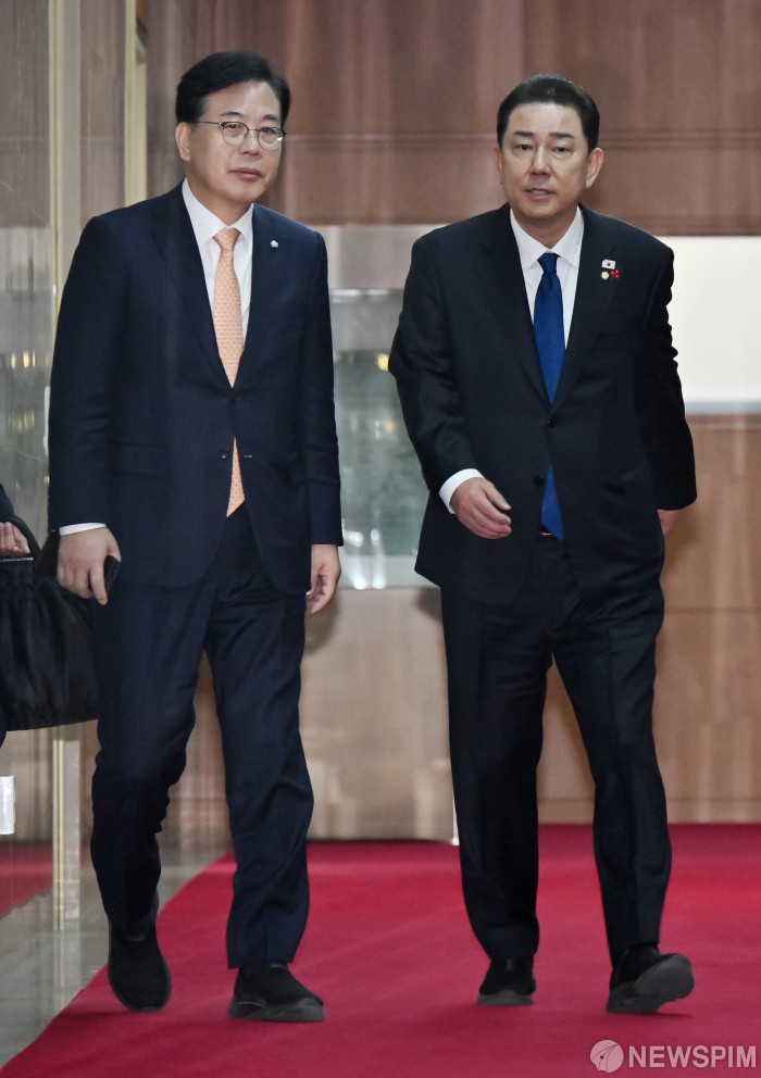 [서울=뉴스핌] 정일구 기자 = 김병기 더불어민주당 원내대표와 송언석 국민의힘 원내대표가 9일 서울 여의도 국회에서 우원식 국회의장 주재 회동을 마치고 이동하고 있다. 2025.12.09 mironj19@newspim.com