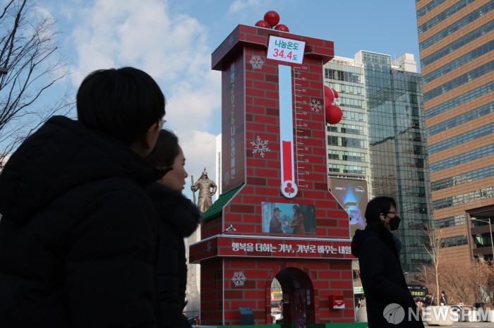[서울=뉴스핌] 이길동 기자 = 9일 서울 종로구 광화문 광장에 설치된 사랑의 온도탑 나눔온도가 34.4도를 가리키고 있다. 사랑의열매 사회복지공동모금회 '희망2026나눔캠페인'의 올해 목표 모금액은 4500억원으로 1%인 45억원이 모일 때마다 온도탑 온도가 1도씩 올라간다. 2025.12.09gdlee@newspim.com