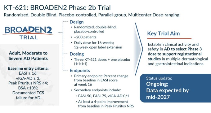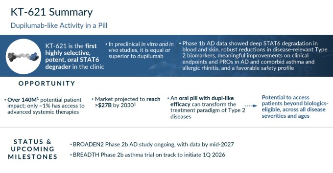 마이놀피 CEO는 "BroADen 연구 결과는 우리의 기대를 뛰어넘었으며, 업계 선도적인 STAT6 분해제 프로그램을 강력히 입증하는 추가 근거가 됐다"며 "KT-621은 STAT6 분해, 바이오마커 조절, 임상적 활성, 다른 동반 제2형 염증 질환에 대한 영향, 안전성 등 모든 평가 지표에서 하루 한 번 복용하는 경구용 제제의 잠재력을 보여주었다"고 강조했다.