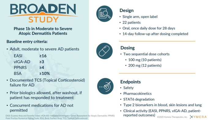 키메라 테라퓨틱스(종목코드: KYMR)는 현재 중등도에서 중증 아토피 피부염 환자를 대상으로 한 BROADEN2 임상 2b상을 진행 중이며, 환자 투약이 이미 시작됐다. 약 200명의 환자를 대상으로 16주 동안 위약 대비 3가지 용량을 평가하는 이 연구의 결과는 2027년 중반 발표될 예정이다. 주요 평가변수는 EASI 점수의 백분율 변화다.