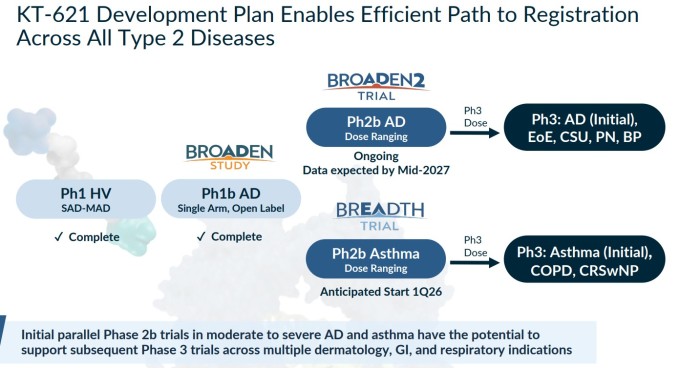 이들 연구는 KT-621 개발을 가속화하고, 이후 다수의 제2형 피부과·소화기·호흡기 질환 적응증을 대상으로 병행 진행될 임상 3상 등록 시험에서 적절한 용량을 선정하는 데 기여할 것으로 기대된다.