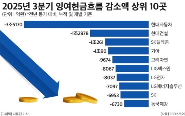 감소폭은 현대자동차가 가장 컸다. 현대차는 미국과의 관세 협정 지연 영향으로 영업활동 현금흐름이 36.0% 줄었고, 자본적 지출은 6.0% 늘었다. 잉여현금흐름은 4조8821억원에서 1조3651억원으로 3조5170억원 감소했다. 이어 현대건설(▼1조2978억원), SK텔레콤(▼1조261억원), 기아(▼1조90억원), 고려아연(▼9674억원), LIG넥스원(▼8067억원), LG전자(▼8037억원), LG에너지솔루션(▼7097억원), SK(▼6953억원), 동국제강(▼6730억원)이 뒤를 이었다.