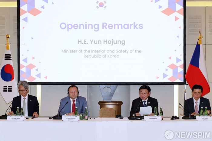 [서울=뉴스핌] 윤호중 행정안전부 장관이 9일(현지시간) 체코 프라하 만다린 오리엔탈 호텔에서 열린 한-체코 공공행정 전문가 라운드테이블에서 인사말을 하고 있다. [사진=행정안전부] 2025.12.10 photo@newspim.com