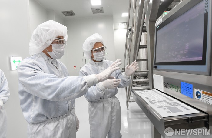 | [서울=뉴스핌]추경호 부총리 겸 기획재정부 장관이 24일 오후 바이오산업 육성과 관련 청주 오송 소재 에이프로젠 오송공장을 방문,김재섭 회장(오른쪽)의 안내를 받으며 연구시설을 둘러보고 있다. [사진=기획재정부] 2023.05.24 photo@newspim.com |