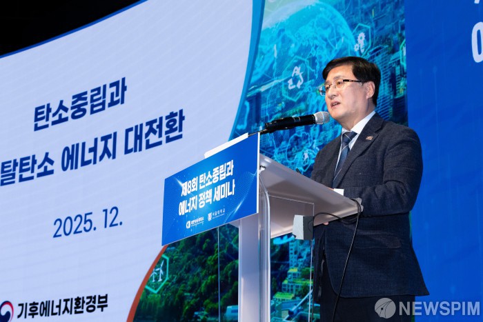 [서울=뉴스핌] 김성환 기후에너지환경부 장관이 10일 서울 중구 대한상공회의소에서 열린 제8회 탄소중립과 에너지 정책 세미나에서 '정부의 탄소중립과 에너지 정책방향 및 이행전략'을 주제로 기조강연을 하고 있다. [사진=기후에너지환경부] 2025.12.10 photo@newspim.com