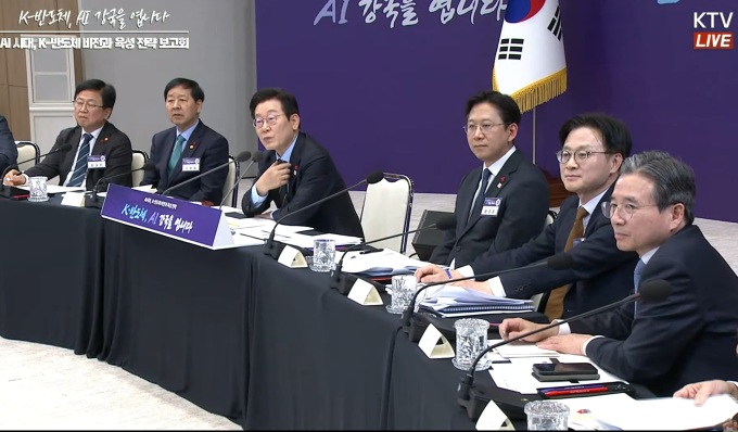 | 이재명 대통령이 10일 오후 용산 대통령실에서 'AI시대의 K-반도체 비전과 육성 전략 보고회'를 주재하고 있다. [사진=KTV] |