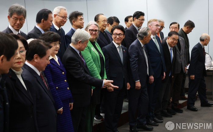 [서울=뉴스핌] 김학선 기자 = 김민석 국무총리가 10일 서울 마포구 연세대학교 김대중도서관에서 열린 김대중대통령 노벨평화상 수상 25주년 기념식에서 기념촬영을 마치고 자리로 향하고 있다. 2025.12.10 yooksa@newspim.com