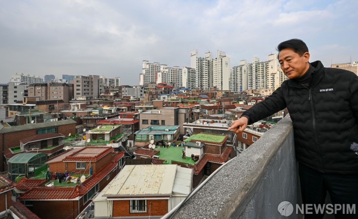 [서울=뉴스핌] 양윤모 기자 = 오세훈 서울시장이 10일 오후 영등포구 대림동 855-1 일대 대림1구역 재개발 현장을 찾아 직접 확인하고 있다. 대림1구역은 제3종 일반주거지역으로 용적률은 283.2%가 적용돼 35층 규모의 12개 동, 총 1,026세대로 조성된다. 2025.12.10 yym58@newspim.com