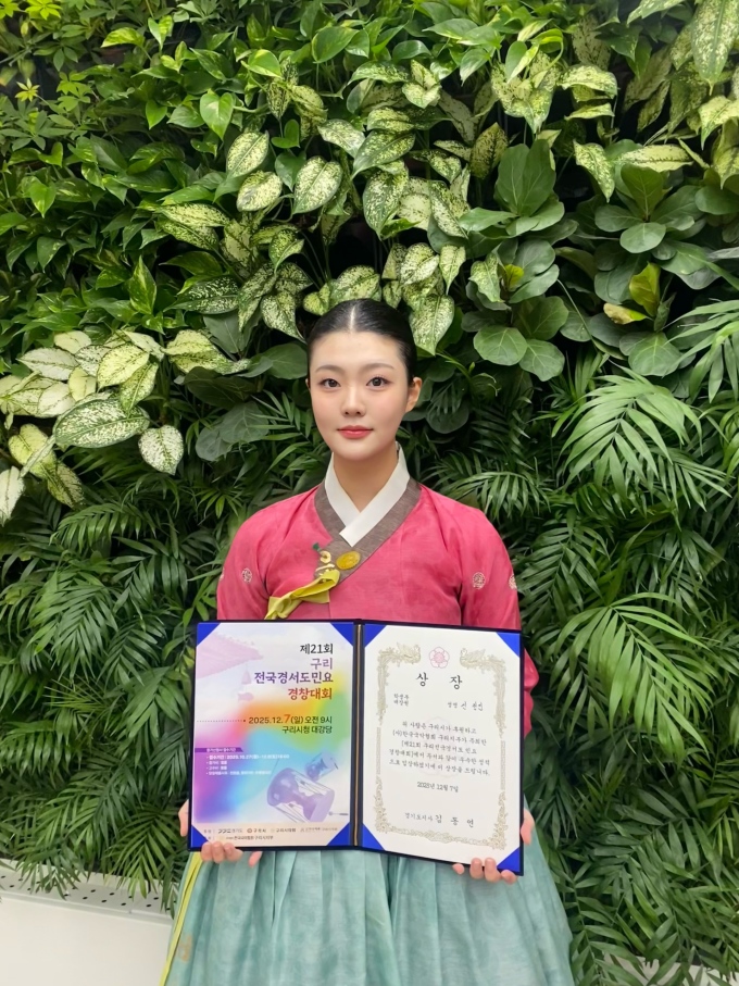 신정인 학생은 학생부 최고상인 대장원과 함께 경기도지사상을 받았다. 신정인 학생은 그간 전국 단위 경연에서 꾸준히 수상하며 국악적 재능을 인정받아 올해 국립전통예술고등학교 민요과에 합격한 인재다.