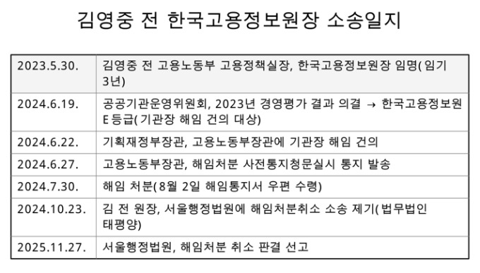 김 전 원장은 윤석열 정부 당시인 2023년 5월 30일 3년 임기로 취임했다. 다만 그해 말 실시된 2023년 공공기관 경영실적평가에서 고용정보원이 E등급(아주 미흡)을 받자 책임을 물어 해임됐다.