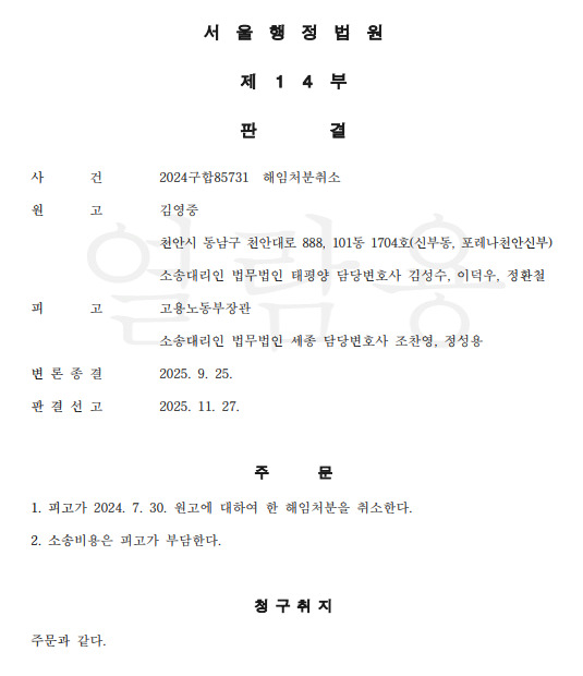14일 고용노동부, 법원 등에 따르면 서울행정법원 제14부는 지난 27일 김 전 원장이 고용노동부 장관을 상대로 낸 해임처분 취소 소송에서 원고 승소 판결을 내렸다. 재판부는 "피고가 2024년 7월 30일 자로 내린 해임 처분을 취소한다"고 밝혔다.