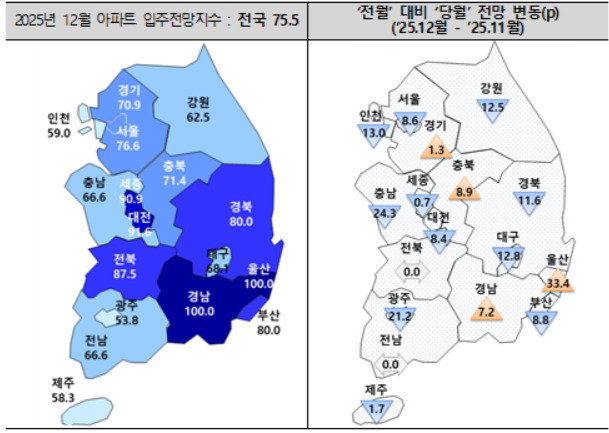 서울은 8.6p(85.2→76.6), 인천은 13.0p(72.0→59.0)은 하락했고, 경기는 1.3p(69.6→70.9)는 소폭 상승했다.