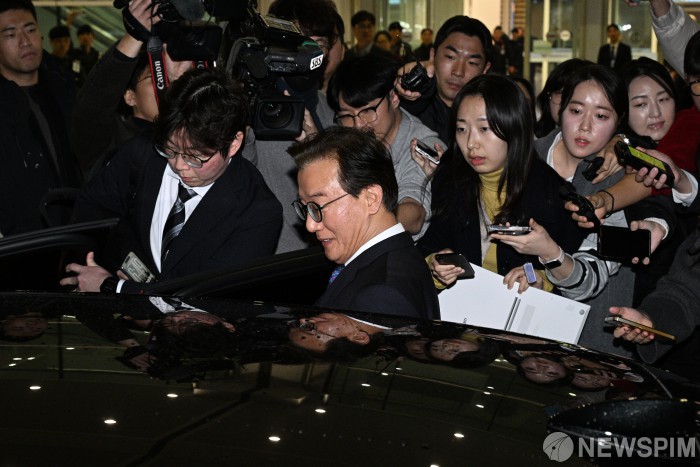 [영종도=뉴스핌] 김학선 기자 = 통일교 금품 수수 의혹에 연루된 전재수 해양수산부 장관이 11일 인천국제공항 제2여객터미널에서 사의를 표명한 뒤 차량에 탑승하고 있다. 2025.12.11 yooksa@newspim.com