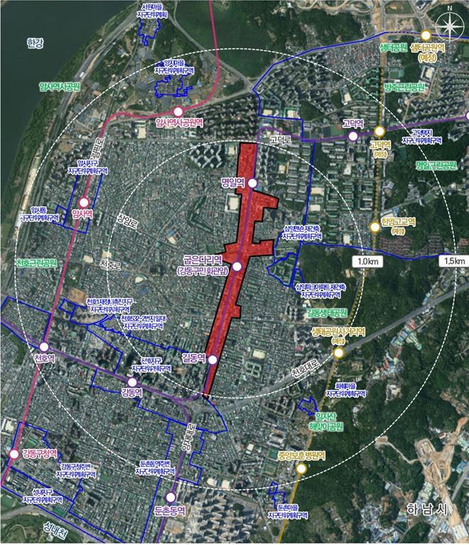 [서울=뉴스핌] 이동훈 선임기자 = 서울 강동구 양재대로변의 서울지하철 5호선 길동역·굽은다리역·명일역 역세권 지구단위계획구역이 지정됐다. 이들 지역에선 양재대로 랜드마크화 및 보행환경 개선으로 도시경관 경쟁력을 강화하는 건축 행위가 이뤄질 전망이다.