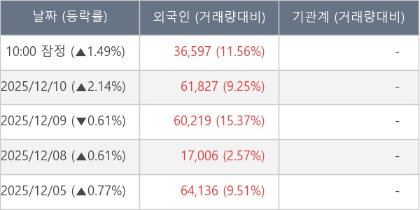 [서울=뉴스핌] 로보뉴스 = 11일 10시 15분 현재 에스와이스틸텍(365330)은 전일 대비 1.49% (현재가 3,395원) 상승했고, 외국인이 최근 6일 연속 순매수(누적 30.63만 주, 잠정) 행진을 하고 있다.