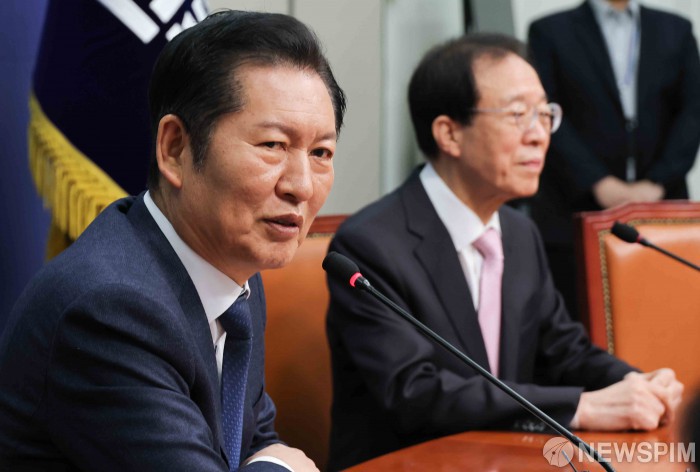 [서울=뉴스핌] 윤창빈 기자 = 정청래 더불어민주당 대표가 11일 서울 여의도 국회에서 이석연 국민통합위원장을 접견한 가운데 발언하고 있다. 2025.12.11 pangbin@newspim.com