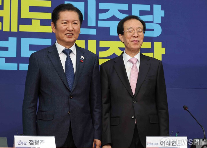 [서울=뉴스핌] 윤창빈 기자 = 정청래 더불어민주당 대표가 11일 서울 여의도 국회에서 이석연 국민통합위원장을 접견하고 있다. 2025.12.11 pangbin@newspim.com