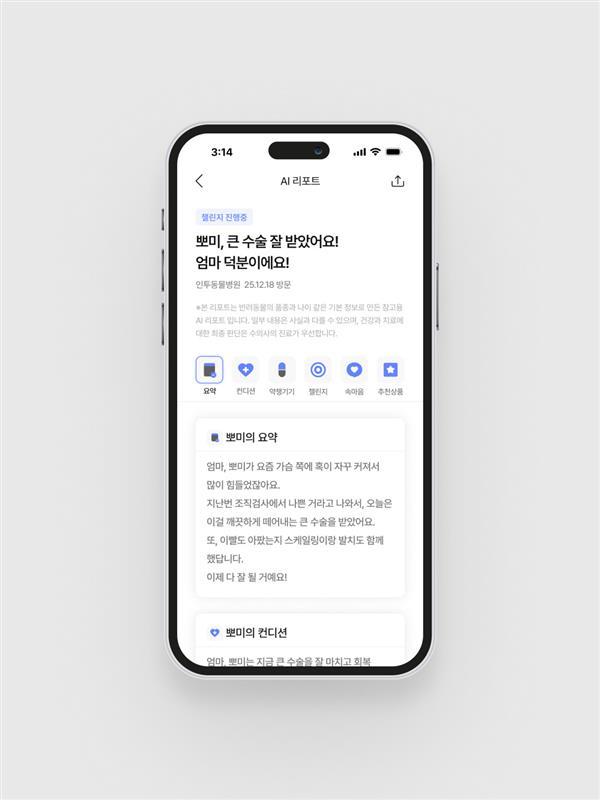 보호자는 진료 내용을 보다 정확하게 이해할 수 있고 병원도 반복적인 설명 부담을 줄이는 효과를 얻고 있다. 특히 단순 녹취를 넘어 반려동물의 건강 이력과 과거 진료 기록을 함께 분석해 보호자에게 개인화된 형태로 전달한다는 점에서 차별화된다. 같은 질환이라도 반려동물의 연령, 체중, 과거 병력에 따라 관리 가이드를 다르게 제공한다.
