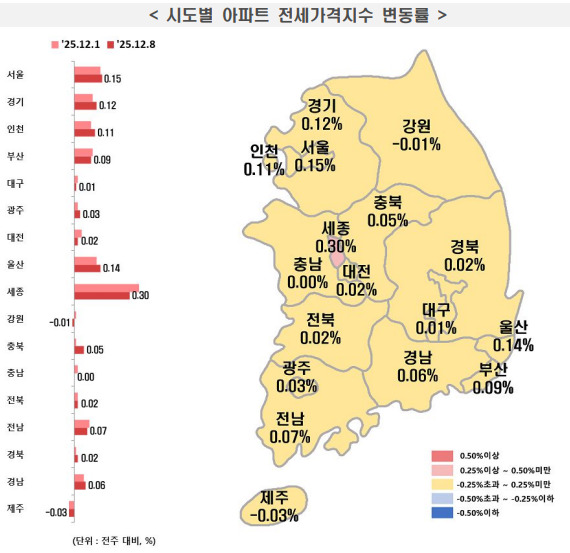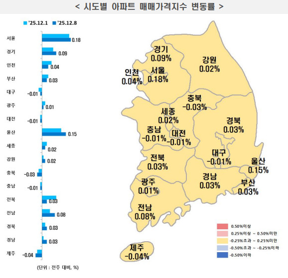 11일 한국부동산원의 2025년 12월 2주(12월 8일 기준) 전국주간 아파트가격 동향 조사 결과에 따르면 매매가격은 0.06%, 전세가격은 0.09% 상승을 각각 기록했다.