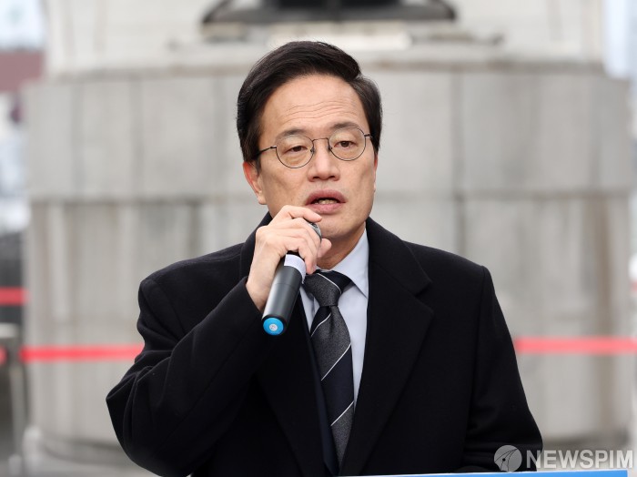 [서울=뉴스핌] 최지환 기자 = 박주민 더불어민주당 의원이 11일 오전 서울 종로구 광화문광장에서 서울시장 출마선언을 하고 있다. 2025.12.11 choipix16@newspim.com