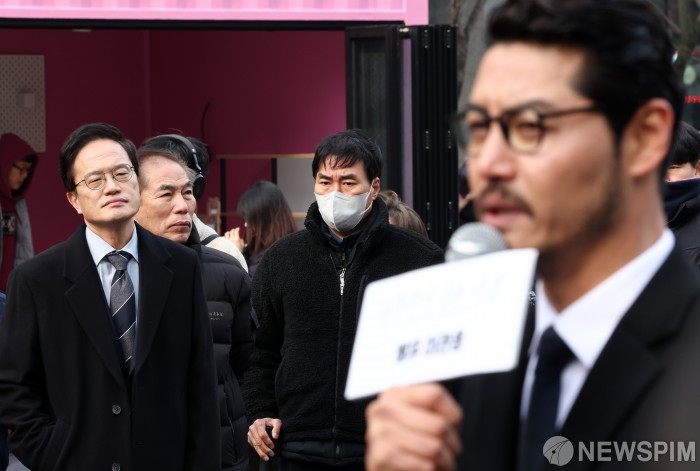 [서울=뉴스핌] 최지환 기자 = 박주민 더불어민주당 의원이 11일 오전 서울 종로구 광화문광장에서 서울시장 출마선언을 앞두고 지지자의 지지발언을 지켜보고 있다. 2025.12.11 choipix16@newspim.com