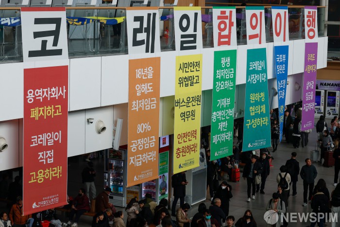 [서울=뉴스핌] 류기찬 기자 = 전국철도노동조합이 파업을 유보함에 따라 모든 열차가 정상 운행하고 있는 11일 오전 서울역 대합실에 노조 요구안이 적힌 현수막이 걸려 있다. 2025.12.11 ryuchan0925@newspim.com