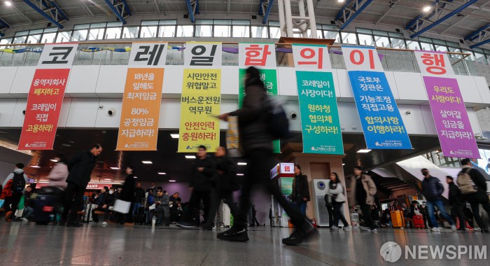 [서울=뉴스핌] 류기찬 기자 = 전국철도노동조합이 파업을 유보함에 따라 모든 열차가 정상 운행하고 있는 11일 오전 서울역 대합실에 노조 요구안이 적힌 현수막이 걸려 있다. 2025.12.11 ryuchan0925@newspim.com