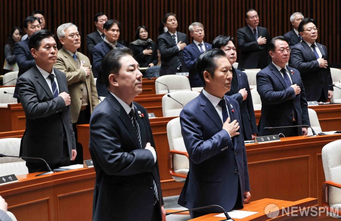 [서울=뉴스핌] 윤창빈 기자 = 정청래 더불어민주당 대표, 김병기 원내대표 등 소속 의원들이 11일 서울 여의도 국회에서열린 의원총회에서 국민의례를 하고 있다. 2025.12.11 pangbin@newspim.com