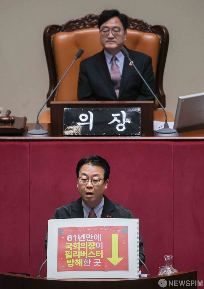 [서울=뉴스핌] 윤창빈 기자 = 곽규택 국민의힘 의원이 11일 서울 여의도 국회에서 열린 본회의에서 형사소송법 일부개정법률안(대안)에 대한 무제한 토론을 하고 있다. 2025.12.11 pangbin@newspim.com