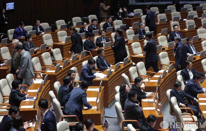 [서울=뉴스핌] 윤창빈 기자 = 곽규택 국민의힘 의원이 11일 서울 여의도 국회에서 열린 본회의에서 형사소송법 일부개정법률안(대안)에 대한 무제한 토론을 시작하자 더불어민주당 의원들이 회의장을 나서고 있다. 2025.12.11 pangbin@newspim.com
