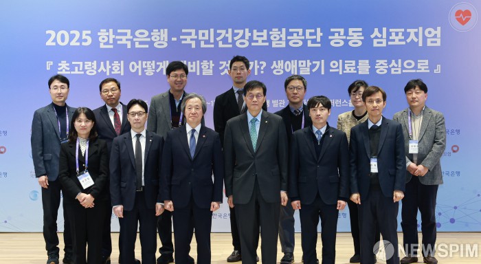 [서울=뉴스핌] 이창용 한국은행 총재와 정기석 건강보험공단 이사장이 11일 서울 중구 한국은행에서 열린 2025 한국은행-국민건강보험공단 공동 심포지엄에서 참석자들과 기념촬영을 하고 있다. [사진=한국은행] 2025.12.11 photo@newspim.com