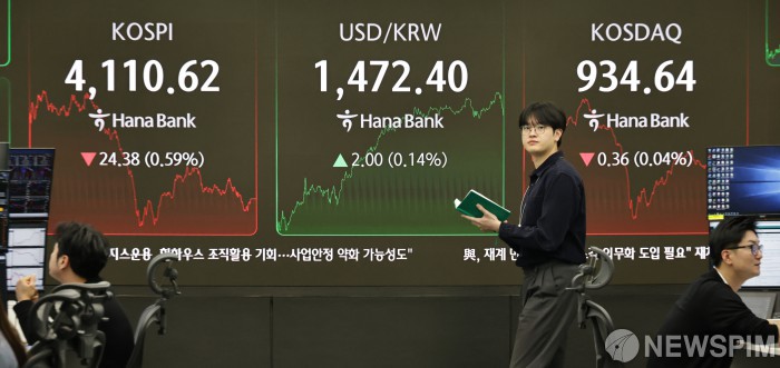[서울=뉴스핌] 양윤모 기자 = 11일 오후 코스피가 전장 종가보다 24.38 포인트(0.59%) 하락하며 4110.62로, 코스닥은 0.36 포인트(0.04%) 하락한 934.64로 장을 마감한 가운데, 서울 중구 하나은행 딜링룸에서 직원들이 업무를 보고 있다. 서울외환시장에서 달러/원 환율은 전장 대비 2.00원 상승한 1472.40원에 주간거래를 마감했다. 2025.12.11 yym58@newspim.com