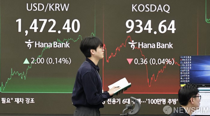 [서울=뉴스핌] 양윤모 기자 = 11일 오후 코스피가 전장 종가보다 24.38 포인트(0.59%) 하락하며 4110.62로, 코스닥은 0.36 포인트(0.04%) 하락한 934.64로 장을 마감한 가운데, 서울 중구 하나은행 딜링룸에서 직원들이 업무를 보고 있다. 서울외환시장에서 달러/원 환율은 전장 대비 2.00원 상승한 1472.40원에 주간거래를 마감했다. 2025.12.11 yym58@newspim.com