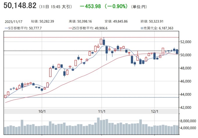 이날 닛케이225평균주가지수는 전일 종가보다 0.90%(453.98엔) 하락한 5만148.82엔에 거래를 마쳤다. 도쿄증권거래소주가지수(TOPIX, 토픽스)도 0.94%(31.78포인트) 내린 3357.24포인트로 마감했다.