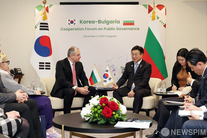 [서울=뉴스핌] 윤호중 행정안전부 장관이 11일(현지시간) 불가리아 소피아 인터컨티네탈 호텔에서 발렌틴 문드로프 불가리아 전자정부부 장관과 면담하고 있다. [사진=행정안전부] 2025.12.11 photo@newspim.com