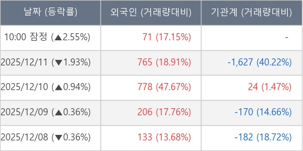 [서울=뉴스핌] 로보뉴스 = 12일 10시 15분 현재 미원에스씨(268280)는 전일 대비 2.55% (현재가 140,800원) 상승했고, 외국인이 최근 10일 연속 순매수(누적 2,643주, 잠정) 행진을 하고 있다.