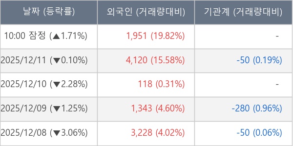 [서울=뉴스핌] 로보뉴스 = 12일 10시 15분 현재 원일티엔아이(136150)는 전일 대비 1.71% (현재가 19,580원) 상승했고, 외국인이 최근 6일 연속 순매수(누적 14,233주, 잠정) 행진을 하고 있다.