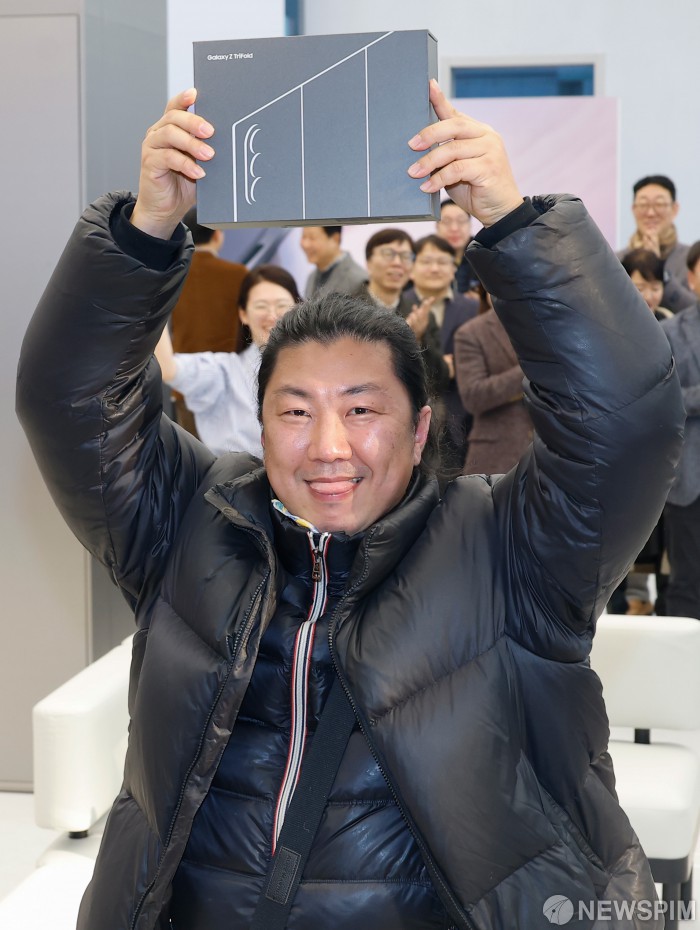 [서울=뉴스핌] 류기찬 기자 = 삼성전자의 두 번 접히는 '갤럭시 Z 트라이폴드' 첫 판매일인 12일 오전 서울 서초구 삼성 강남에서 1호 구매자가 박스를 들어보이고 있다. 2025.12.12 ryuchan0925@newspim.com