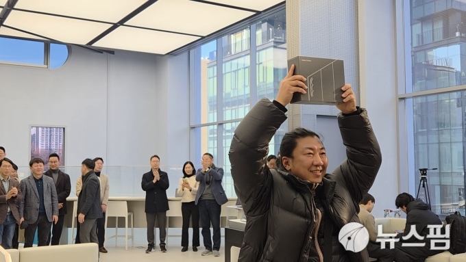 오전 10시 정각, 첫 개통자가 등장하자 매장 안은 박수와 환호로 가득찼다. 주인공은 전날 오전 11시부터 기다렸다는 1982년생 조완우 씨였다. 조씨는 "현재 갤럭시 Z 폴드6와 아이폰 15 프로맥스를 이용하고 있는데 특별한 얼리어답터는 아니지만, 트라이폴드는 아이폰보다 더 우위에 있다는 판단이 들어서 구매를 결정했다"고 설명했다. 그는 "제품이 기계 같지 않고 디테일이 뛰어나다"며 "마치 하나의 예술작품 같은 느낌을 받았다"고 말했다. 이어 "트라이폴드가 확실한 다음 세대 폼팩터로 자리잡을 거라고 믿고, 덱스를 일상 생활에서 사용할 수 있을 것이라는 기대감이 크다"고 강조했다.