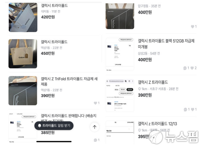 줄을 선 이들 중에는 직접 쓰기 위한 구매자만 있는 건 아니었다. 70대 한 남성은 무슨 기종을 쓰는지도 잘 모른다고 했지만, 트라이폴드를 사러 나온 이유를 묻자 "수고비를 받고 대신 사주러 나왔다"고 짧게 답했다. 초기 생산량이 적고 매장 한정 판매인만큼, 리셀(되팔기)을 노린 수요도 적지 않다는 관측이다. 실제로 오전 10시 30분쯤부터 중고거래 플랫폼 당근에서는 갤럭시 트라이폴드 판매 글이 400만원 선에 다수 올라오기 시작했다.