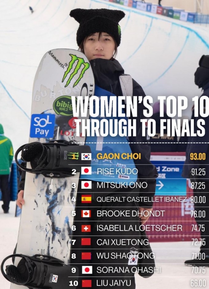 최가온은 극적인 역전승을 거뒀다. 93.00으로 예선 1위로 결선에 오른 최가온은 1차 시기에서 23.75점에 그쳤다. 10명 중 7위. 2차 시기를 시작할 때는 10위로 내려앉았다. 1차 시기에서 자신보다 낮은 점수를 받았던 세 선수가 모두 23.75점을 넘어섰다. 예선 2위였던 구도 리세(일본)가 90.25점으로 1위로 나선 상황에서 최가온은 마지막 시도에서 고난도 연기를 매끄럽게 연결하며 92.75점을 찍었다. 강한 바람과 낮은 기온 속에서도 기술 구성이 흔들리지 않았고 착지 정확도까지 갖춰 높은 점수로 이어졌다.